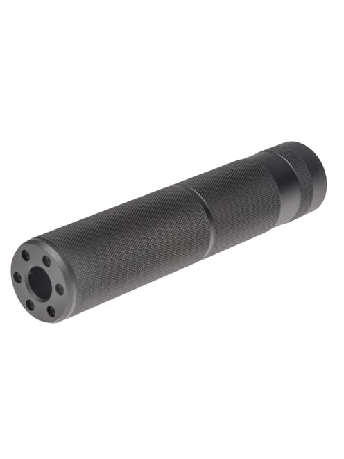 This suppressor has a foam filling to provide some measure of suppression effect, and attaches to any 14mm CCW male threaded outer barrel. The front and rear cap can be unscrewed, so you can add your own secret suppression formula should you so choose. The exterior of the suppressor has knurled sections, making removing and tightening the suppressor a breeze, and also adding some much needed visual interest. This suppressor would be a good choice for anyone looking to create a honey badger style build, as its small diameter (32mm approximately) will allow it to fit inside many rail systems. If in doubt, measure up, and give a mm either side so nothing gets scratched!