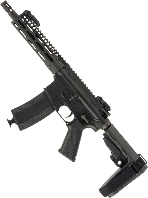 On the outside, we are treated to an M-LOK handguard which matches the real Troy 7.5-inch M-LOK rail perfectly, a flawless replica of the menacing Troy Medieval Flash Suppressor constructed from steel, a Troy-marked receiver and an SB Tactical SBA3 Brace style stock with a rubber butt plate added so you can shoulder it like a real stock. The internals are equally sweet, boasting a 6.03mm tightbore inner barrel, a high torque motor and in-line MOSFET to keep everything in check.